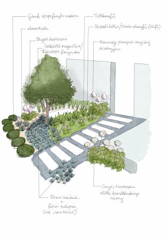 • Az online csomag(ok)ban egy részletes koncepciótervet kapsz, amely a kert szerkezetét, a funkciókat (sütögető, kerti tó stb.), és a növények helyét mutatja meg. A terv mellett a csomag tartalmaz egy komplett útmutatást a növényekről, hogy építés után még sok évig gyönyörködhess bennük.